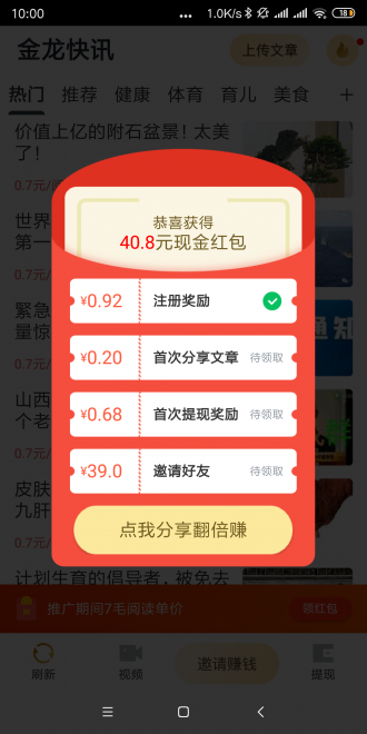 1、新人下载金龙快讯就送1元红包,转发文章单价0.5元至0.7元,支持上传文章
