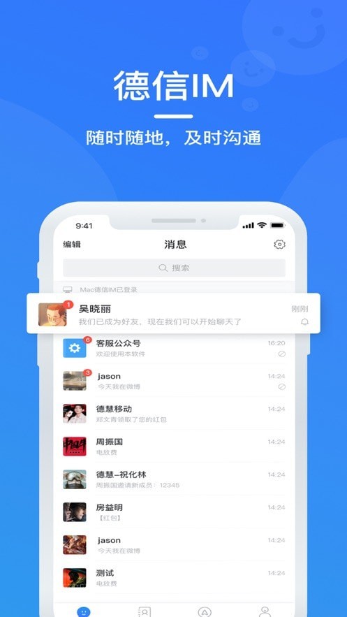 德信app是一款能随时练习沟通的交友通讯软件,用户可以将自己的通讯录中的好友添加到软件中,一键快速进行导入,就能方便大家随时进行线上联系,这里的聊天模式很多样,还能搜索附近用户,一键快速添加好友就能开始畅聊,让沟通交友变得简单起来。