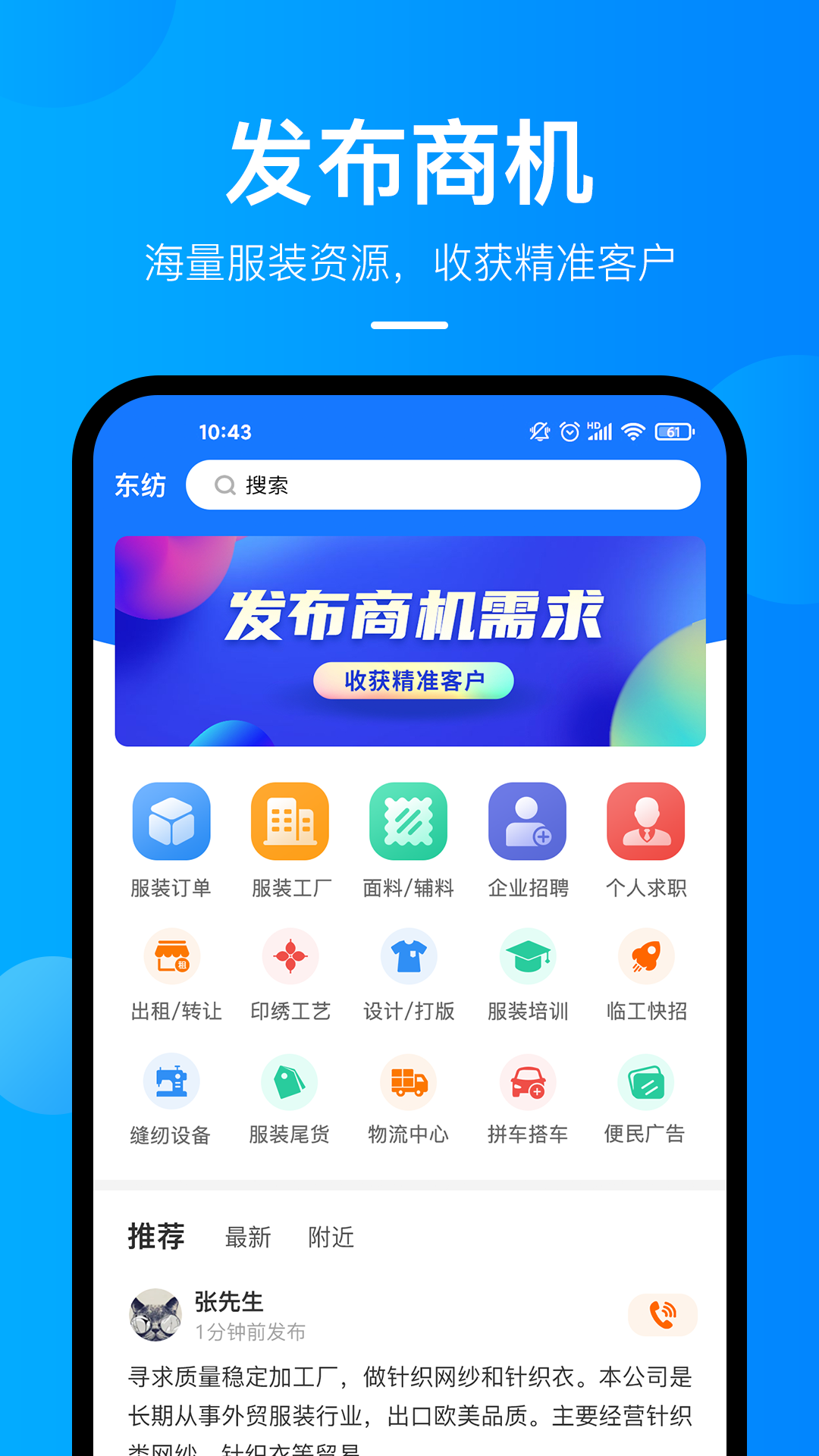 东纺app是一款非常不错的办公软件,软件中可以帮助用户们获取更多行业信息,能够发现更多商机合作项目,功能非常强大好用,能欧帮助用户很好的管理数据与办公,不断提高工作效率,使用快捷高效,满足你的合作项目需求不在话下哦,快来试试吧!