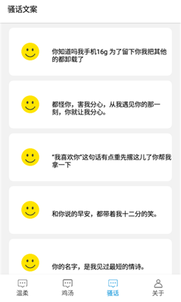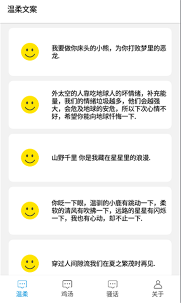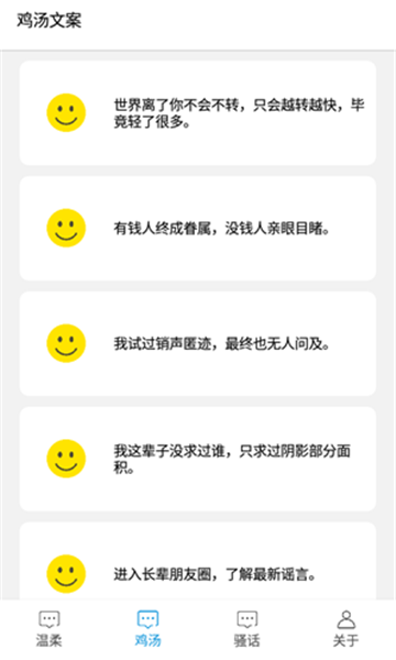 实时更新鸡汤精美文字趣味娱乐软件,具有多种不同类型的文案资料。