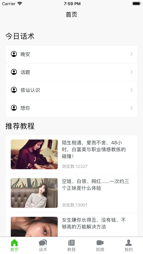 优质的恋爱话术教学app,帮助情侣之中的感情迅速升温,尽情的展示自己的说话情商,全部的话术资源不需要付费,可以免费学习!