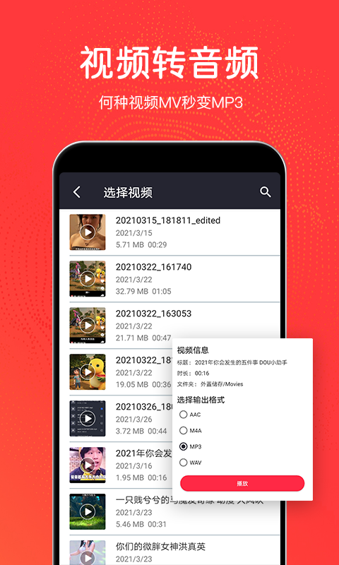 2、MP3转换:轻松格式转换,从视频转换为MP3等,支持MP3,AAC,WAV,M4A,AMR等;