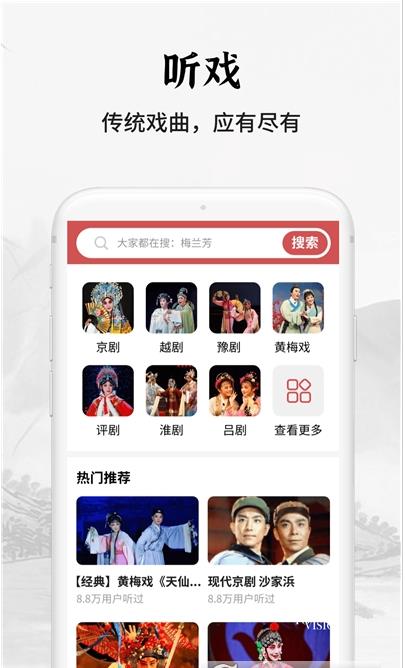 2、越剧、豫剧、黄梅戏、评剧、淮剧、吕剧等类型,能够为用户实时推荐热门的戏曲内容;