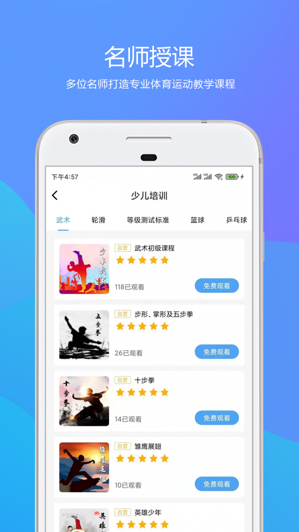 3、运动训练齐全,篮球、足球、排球、武术等少儿训练课程体谈app都有。