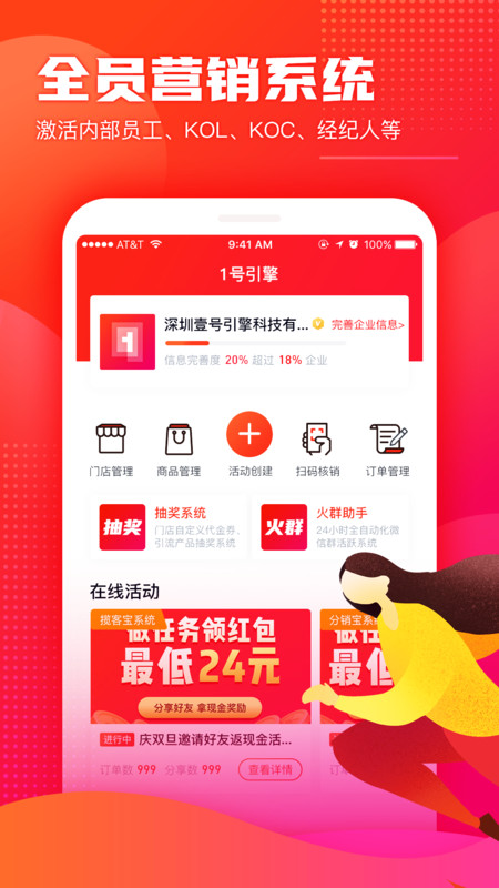 壹号引擎app是一款非常不错的手机营销服务软件,软件中功能十分不错,用户可以随时随地进入软件查询知晓不同的涨粉服务信息,知晓不同的营销操作,帮助电商、线下门店、自媒体账号、微信社群/个人号、课程直播间等快速涨粉引流,一站式营销工具深受大家喜欢,快来试试吧!