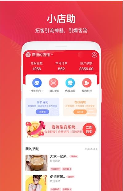 小店助app是一看非常不错的手机办公管理软件,软件中功能强大齐全,能够帮助用户提供非常优质的营销方案,给自己的的店铺等进行引流效果,打造最好的营销方案信息给你,非常好用方便,能够让用户提高工作效率,还有顾客活动参与都是很不错,深受大家喜欢,快来体验一下吧!