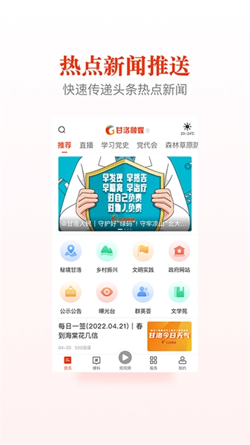 1、专为甘洛县制作的融媒体移动平台,平台拥有新闻资讯,爆料,短视频。