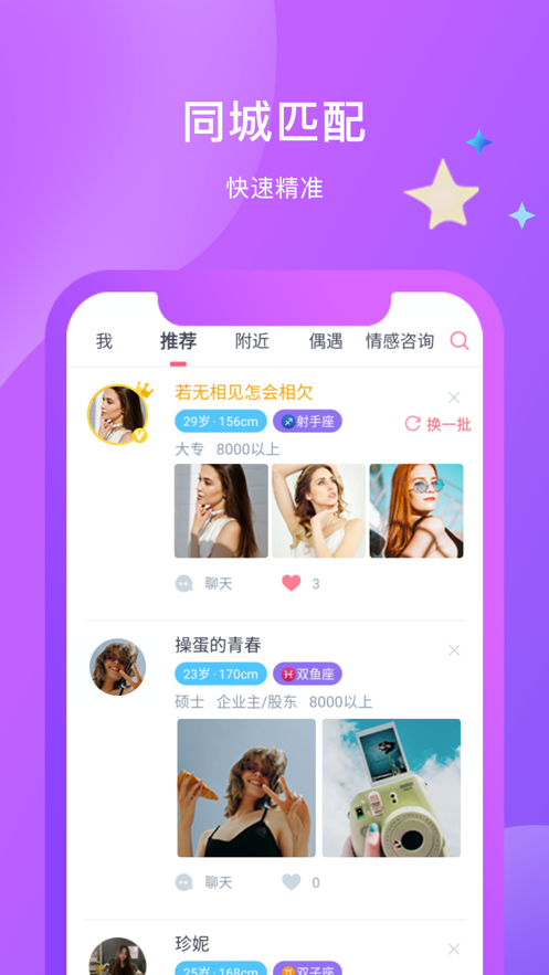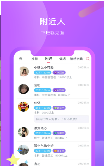 2、支持一键搜索,帮助轻松找到高度合适的朋友,同城约会,帮助摆脱单身;