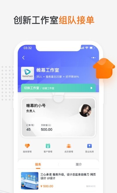 3.当个人无法独立完成复杂项目时,可升级为创新的工作室模式,大大降低创业门槛,上猫匠在线组队,找生意,找合作伙伴。