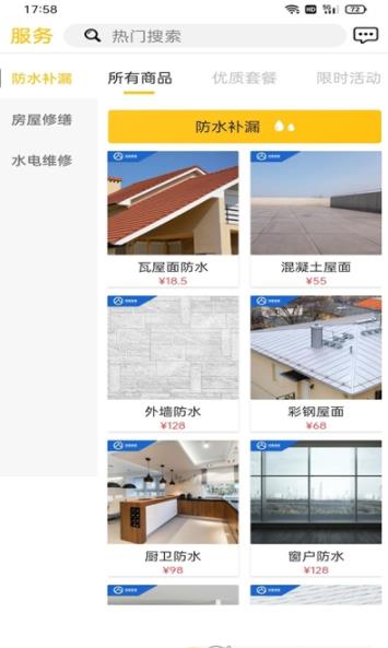 1、开通的维修服务包括:管道疏通、窗台防水、阳台防水、阳光房防水、厨卫防水、地下室防水、墙面裂纹修复、墙面粉刷、厨卫改造、室内改造、水电安装维修等100余种维修品类,一站式解决用户在住房方面的各种难题。