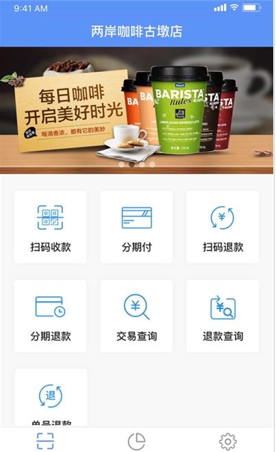 3、扫码收款,扫码退款,单号退款,交易查询,退款查询,门店收入,今日交易,营业流水,收入分析。