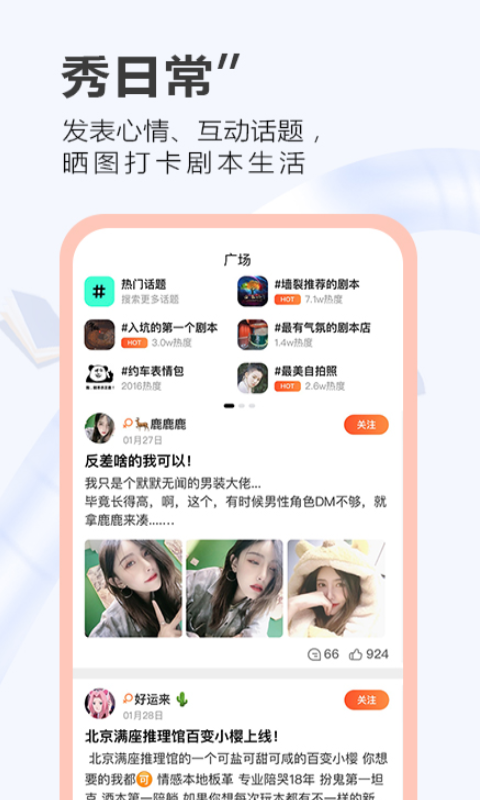 2、发表心情、互动话题,嗮图打卡剧本生活,交朋友,寻找同好、结识剧本;
