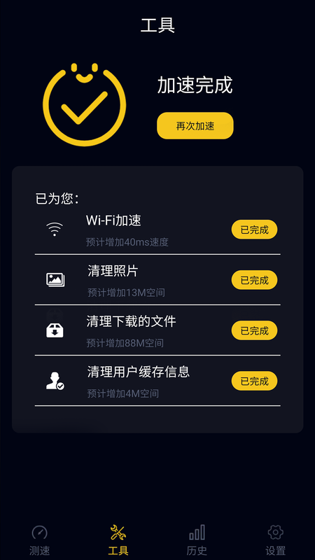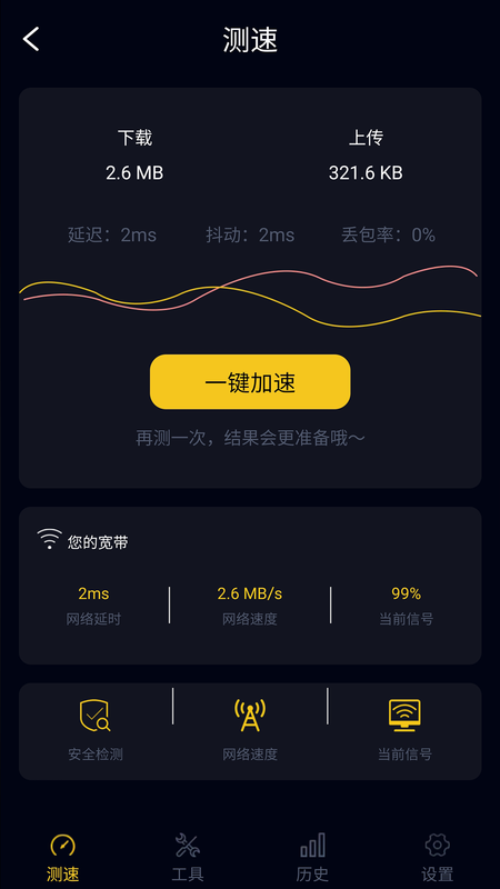 天天WiFi加速最新版app是一款非常好专业的手机网络优化软件,软件中功能齐全好用,能够帮助用户们增强wifi信号,检测wifi稳定性以及加速硬件性能等,可以查看当前网速以及手机流量消耗情况,非常专业好用,帮助用户改善手机信号差,觉得信号不好等问题,快来试试吧!