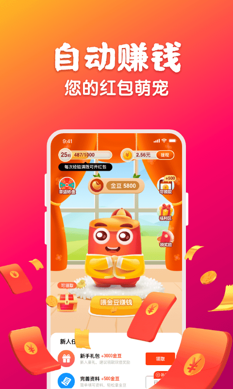 简单完成每日任务获得金豆,用金豆养红包,让TA每天为您自动赚钱。今天你养TA,明天TA养你。红包宠物,全自动网赚小能手,实在是居家休闲良物!