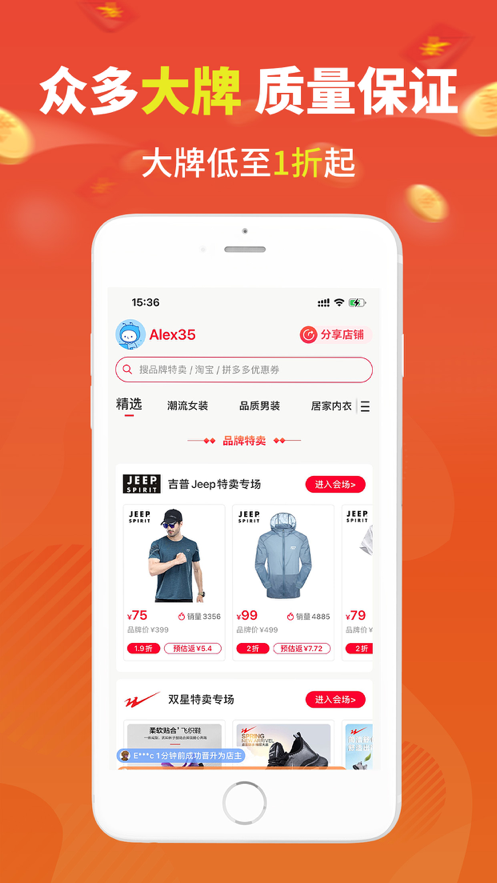 豌豆品牌特卖app是一款具有超多大牌商品的手机网购软件,软件中商品资源都非常齐全,分类也十分清楚,用户想要什么可以直接搜索关键词即可找到,能够满足用户日常网购需要,价格都非常亲民,每天都有不同力度的优惠活动可以自由参加,非常受大家喜欢,快来体验一下吧!
