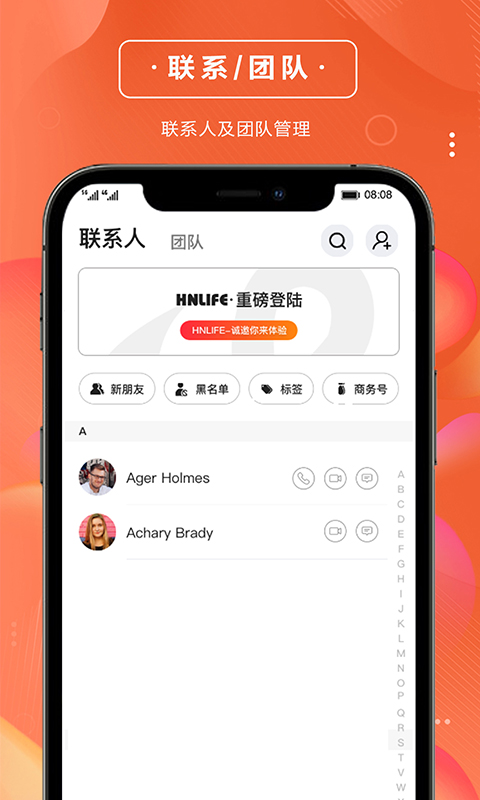 2、联系,团队,联系人及团队管理,发现管理,心情广场及应用满足更多需求;