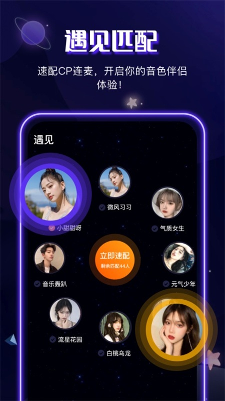 3、遇见匹配,速配CP连麦,开启你的音色伴侣体验;动态广场,动态分享生活,秀出精彩的你,绘声绘色,遇到懂你的TA。