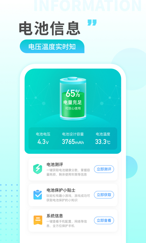 用户可以随时使用该软件查看电池信息,了解手机电池的温度和电压。