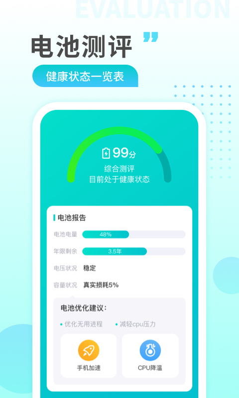 2.电池检测:专业的手机电池健康算法,让你轻松了解电池健康状况,实时检测电池状态。