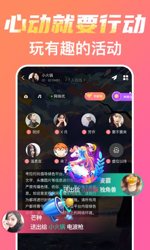 1.语音聊天约会应用程序,在这里您可以结识广泛的朋友,各种语音效果切换可让您体验不同的美丽。