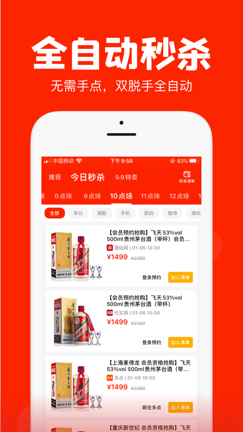 1.无需点击,自动跳转,提交订单后即锁单!秒杀商品、限量商品通通搞定!球鞋、茅台、JK、潮玩手办,只要你想要,一手尽掌握!