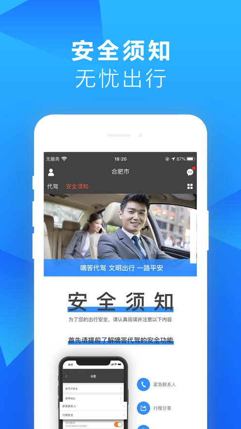 1、提供酒后代驾、商务代驾、旅游代驾诸多服务,通过软件随时轻松叫车、安全回家;