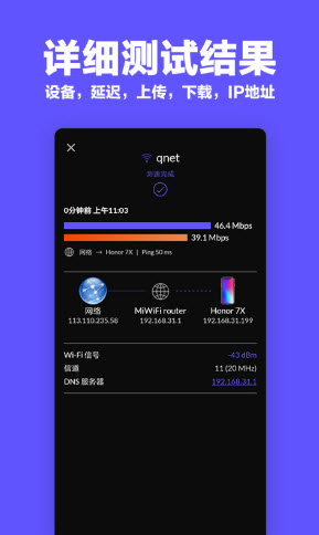 还可显示网络IP地址、下载速率、信号强度、服务器、系统版本等,可实时检测;