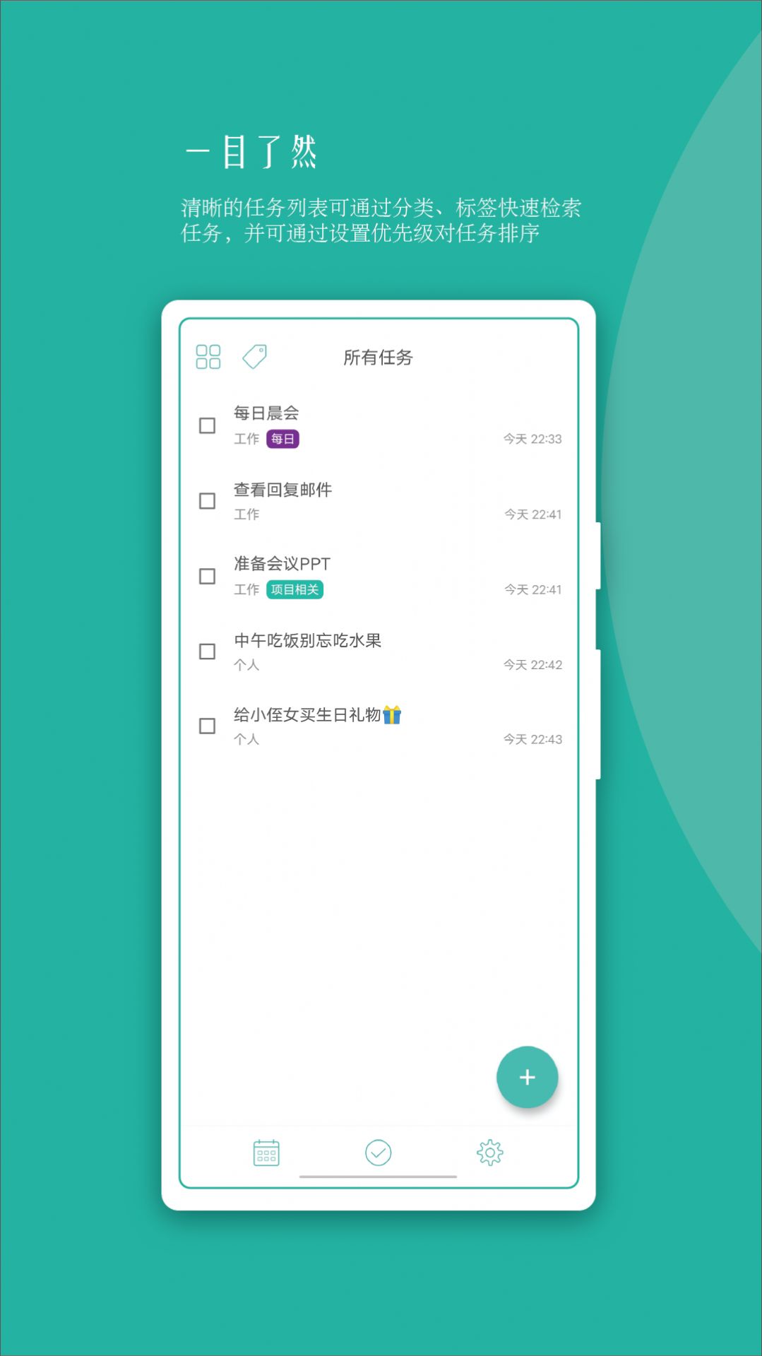 1、一目了然:清晰的任务列表可通过分类、标签快速检索任务,并可通过设置优先级对任务排序;