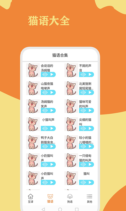 3、猫狗大全,提供汪星人和喵星人模拟叫声,增加与宠物之间的互动趣味。
