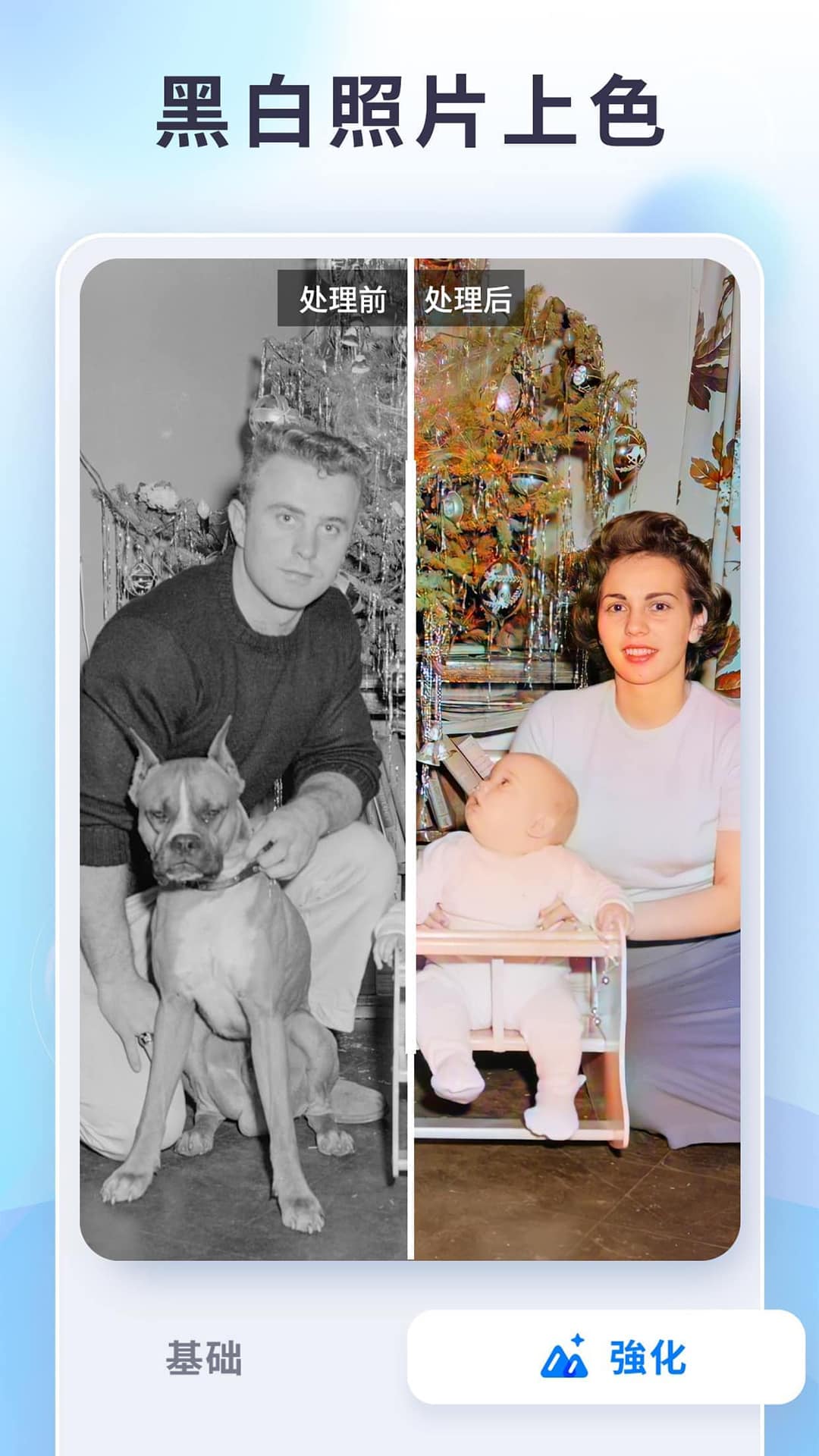 2、件页面非常精美,这里提供照片增强、模糊恢复、图片上色、杂物擦除等多种功能;