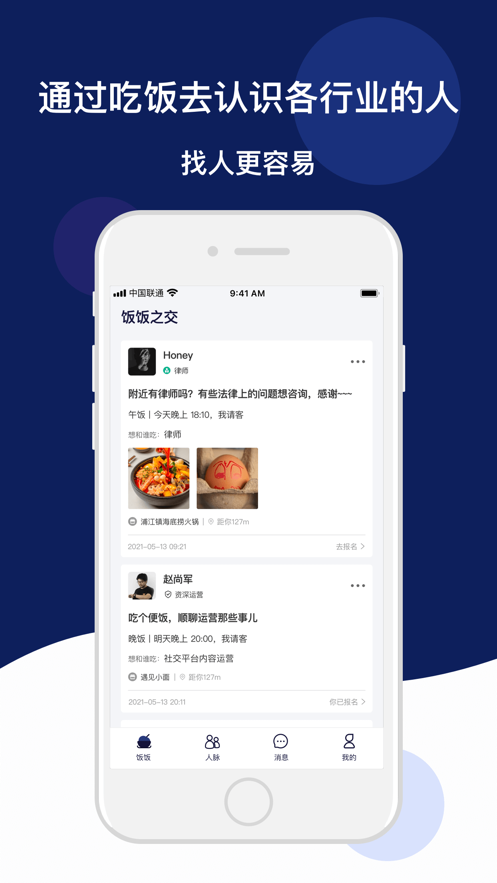 3、一款专注于职场人群通过约吃饭来认识好友,沟通交流,拓展人脉的商务软件。