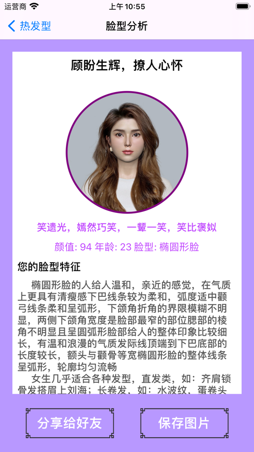 热发型app是一款非常智能化的手机发型软件,软件中功能十分齐全好用,用户可以通过软件对自己的脸型进行分析,智能化的测试自己适合的发型颜色,各种发型可以随意切换,具有详细的分类和介绍,匹配的效果可以自行的浏览,非常智能好用,深受大家喜欢,快来试试吧!