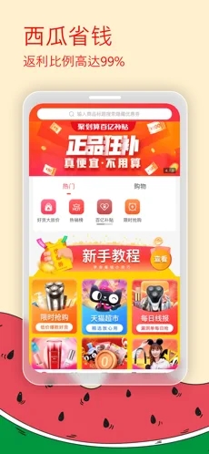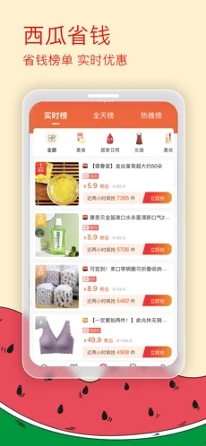西瓜省钱app是一款非常优惠划算的手机网购软件,软件中能够为用户提供各种不同种类的商品,并且分类十分清楚,想要什么可以直接在软件中搜索即可找到,每天都会为大家带来超多的福利可以享受,各种折扣活动可以自由参加,并且商品质量都是经过严格审核,可以放心购买下单哦。