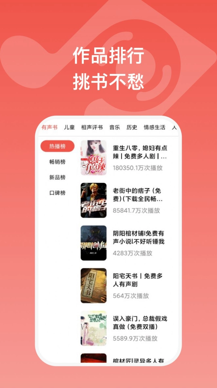 3、海量资源:拥有文学名著、热门小说、曲艺戏曲、名家评书、时事新闻、健康养生等多个大类的海量高清有声阅读资源,每天都有新的资源更新发布
