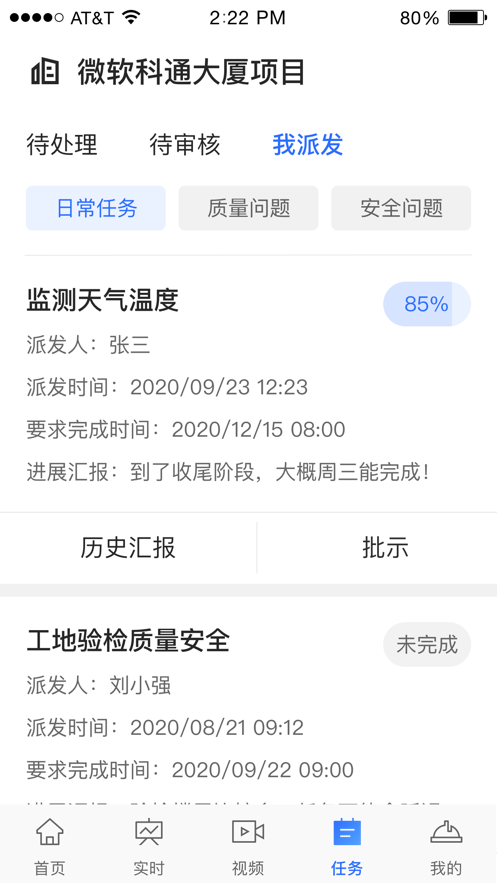 2、任务:对工地的任务流程进行管理,实现任务的分配、处理、审批、关闭;