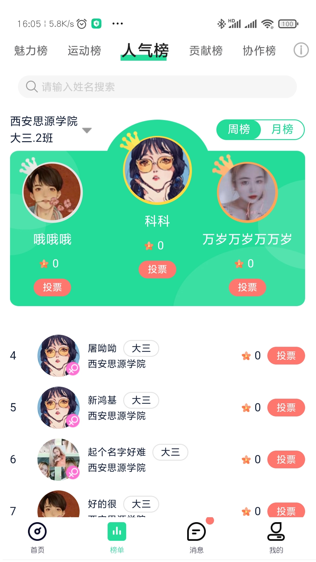 3、平台设计了非常有趣的打榜系统,用户可以在这里为喜欢的朋友进行投票,投票越多的同学就可以占据榜首