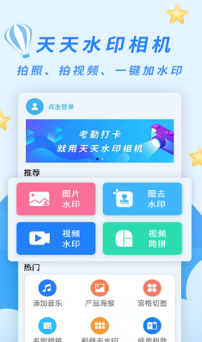 天天水印相机app是一款界面页面设计十分清爽简约的手机拍摄软件,软件中功能齐全好用,可以随时随地拍摄修图,快来试试吧!