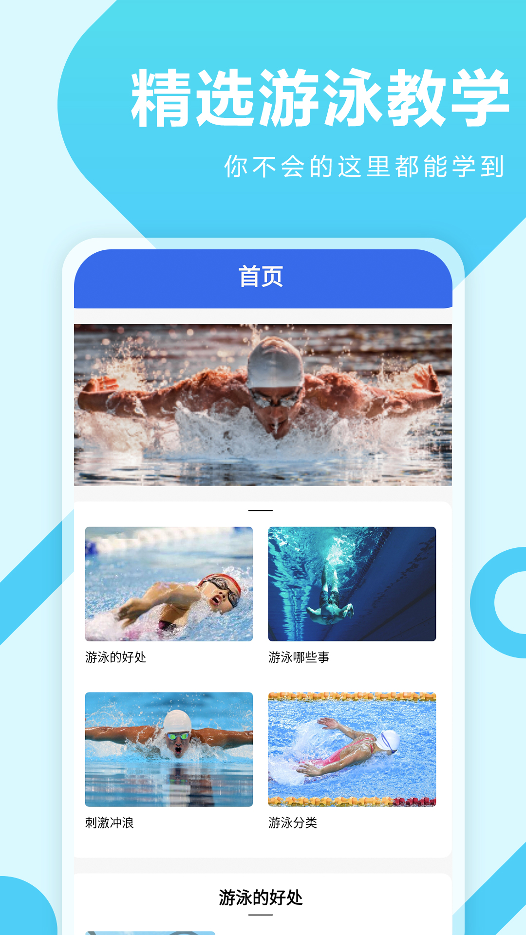 1、本应用教大家各种常见的游泳动作技巧、泳姿的教程图解、游泳前的注意事项