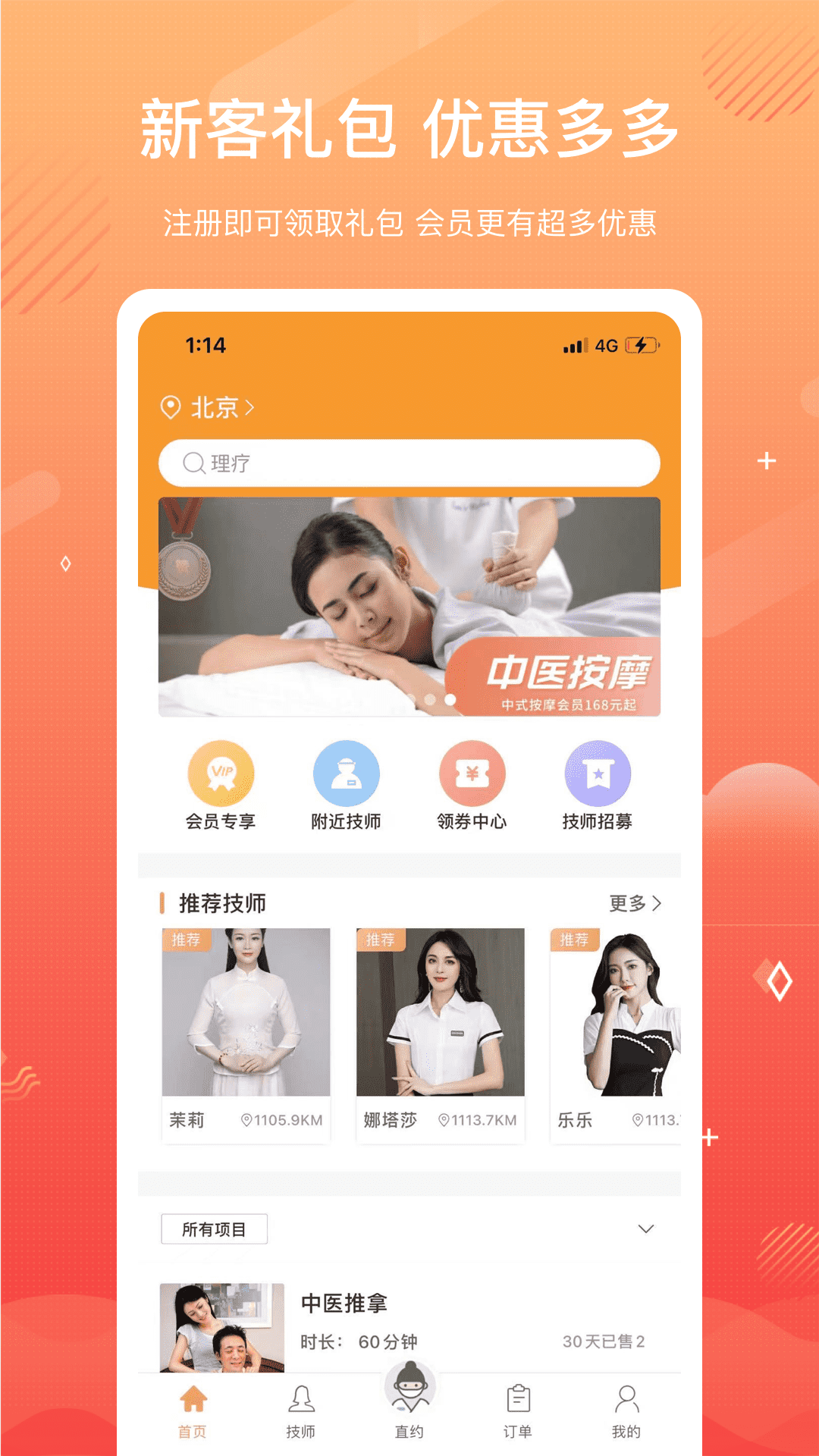 直约平台app是一款专业的上门按摩服务手机软件,在这里,根据用户的实时定位,智能化的筛选出附近的按摩商家,在线可以随意的进行挑选,一键就可以轻松下单,平台安全可靠,不用担心信息会泄露,每天还有不定时的优惠活动,可以领取优惠券下单更便宜,有需要的朋友们可以来体验一下了。