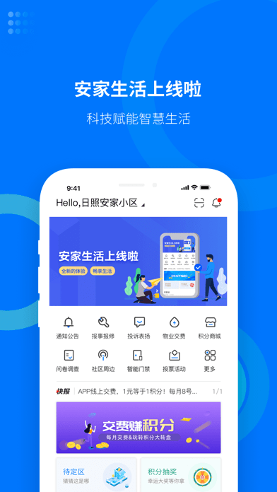 3.安家生活APP是提供门禁、保修、物业缴费、积分商城、社区周边、线上投票等一体化服务