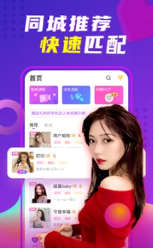 1、【语音速配】缘分随机匹配,暖心陌生人用声音陪伴彼此,陌生人聊天全不怕,语音聊天配对找到真爱,用温柔幽默的声音,单身约会交友平台,和你心动的TA同城约电影,找到有趣的灵魂伴侣,