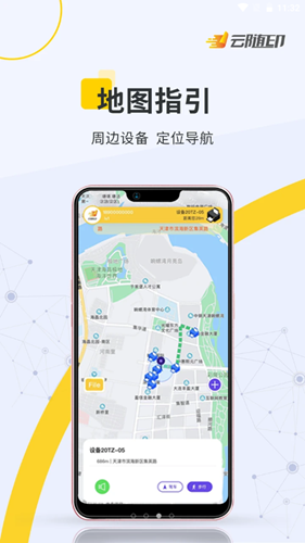 搜索附近的打印设备后,可以为用户提供地图定位导航,让用户快速找到设备的详细位置,使用相关打印功能;