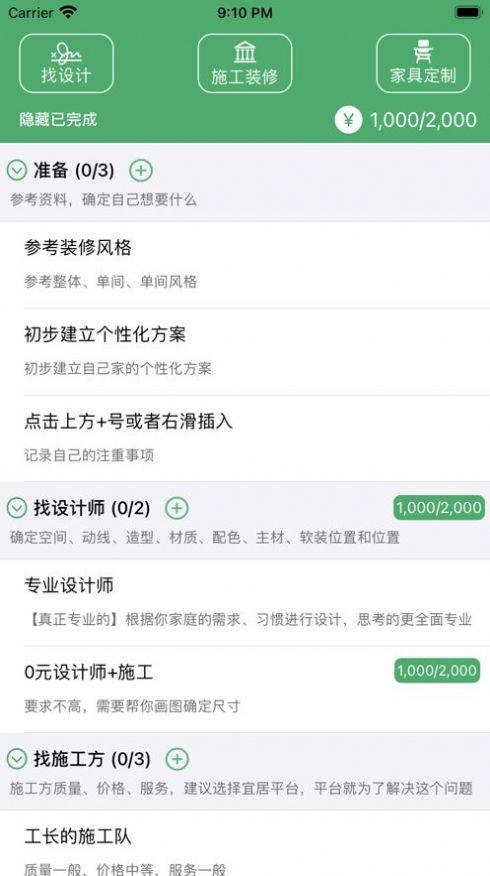 1、装修流程、预算、记账、装修设计、装修施工、家具定制、装修必备;