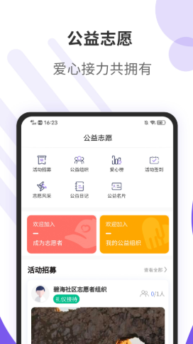 1.在软件中,还有各种的公益活动可以让用户进行参与,加入各种的志愿者团队或者是公益组织,参与各种有意义的活动的发展。