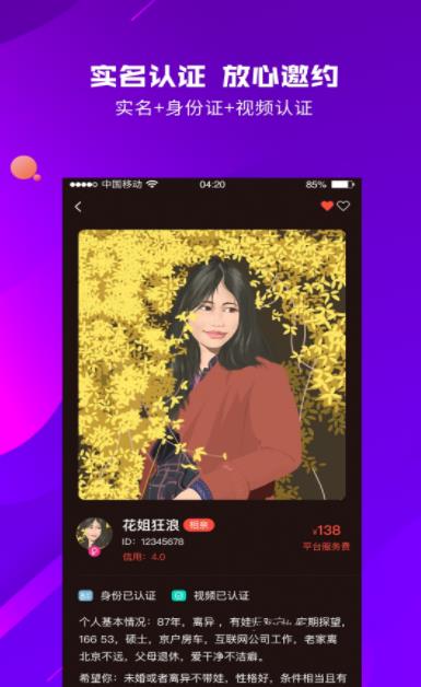 2、实名认证,放心邀约,都是实名认证的身份,交友更放心;