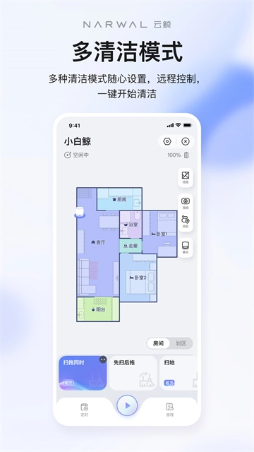 选择房间清洁、清洁次数、拖地湿度等选项,针对不同的使用场景制定专属的清洁方案。