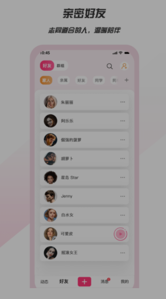 4、添加好友,可私聊,可群聊。查看好友分享新鲜事,记录美好日常。