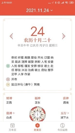 2.黄历:全面的老黄历信息,详细罗列黄历宜忌、黄道吉日等,还附有黄历现代文解读。