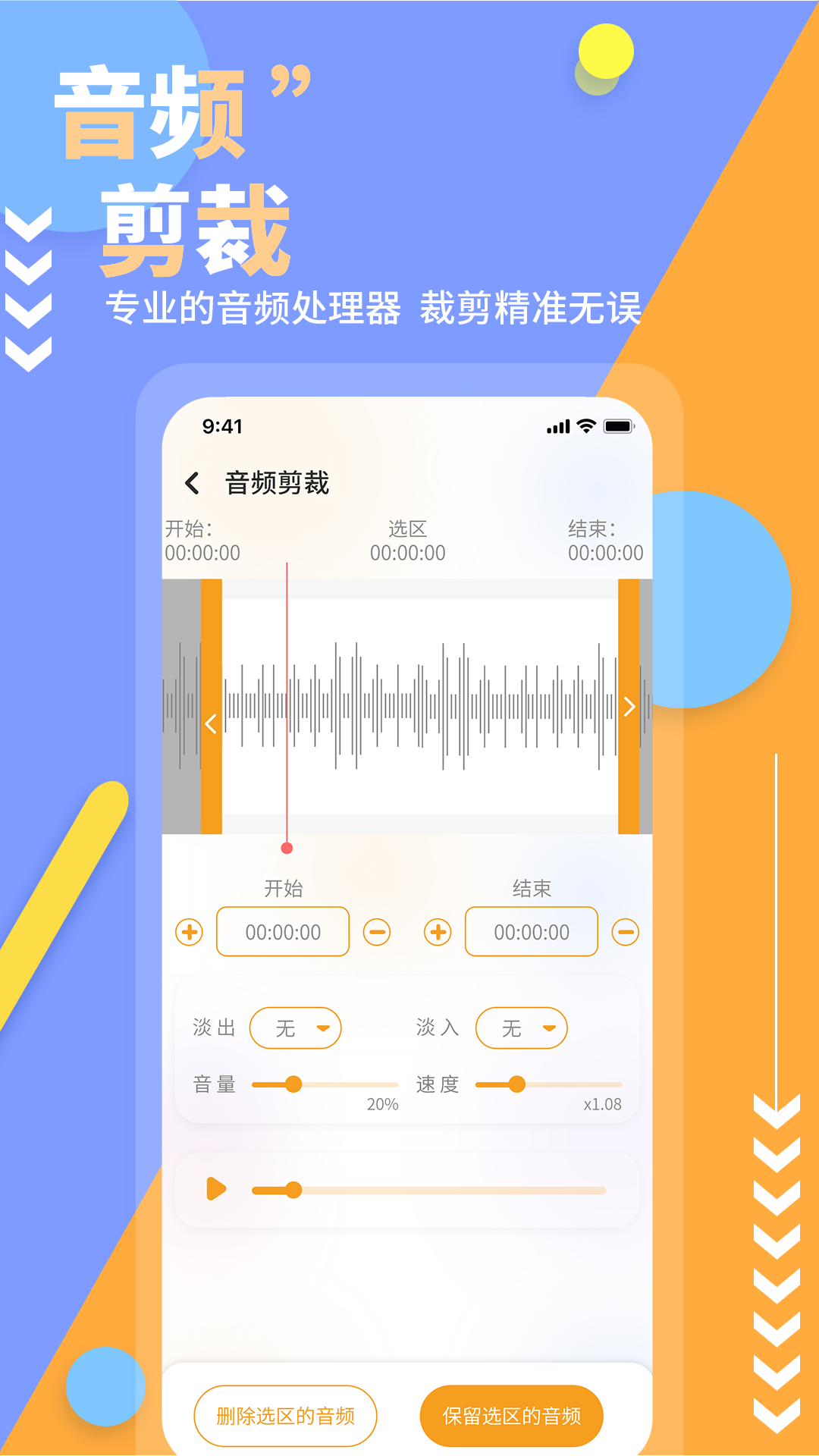 1、在主界面点击音频裁剪图标,选择列表中的任意一列进入音频裁剪界面,滑动或点击顶部的进度条进行音频裁剪范围的限制。