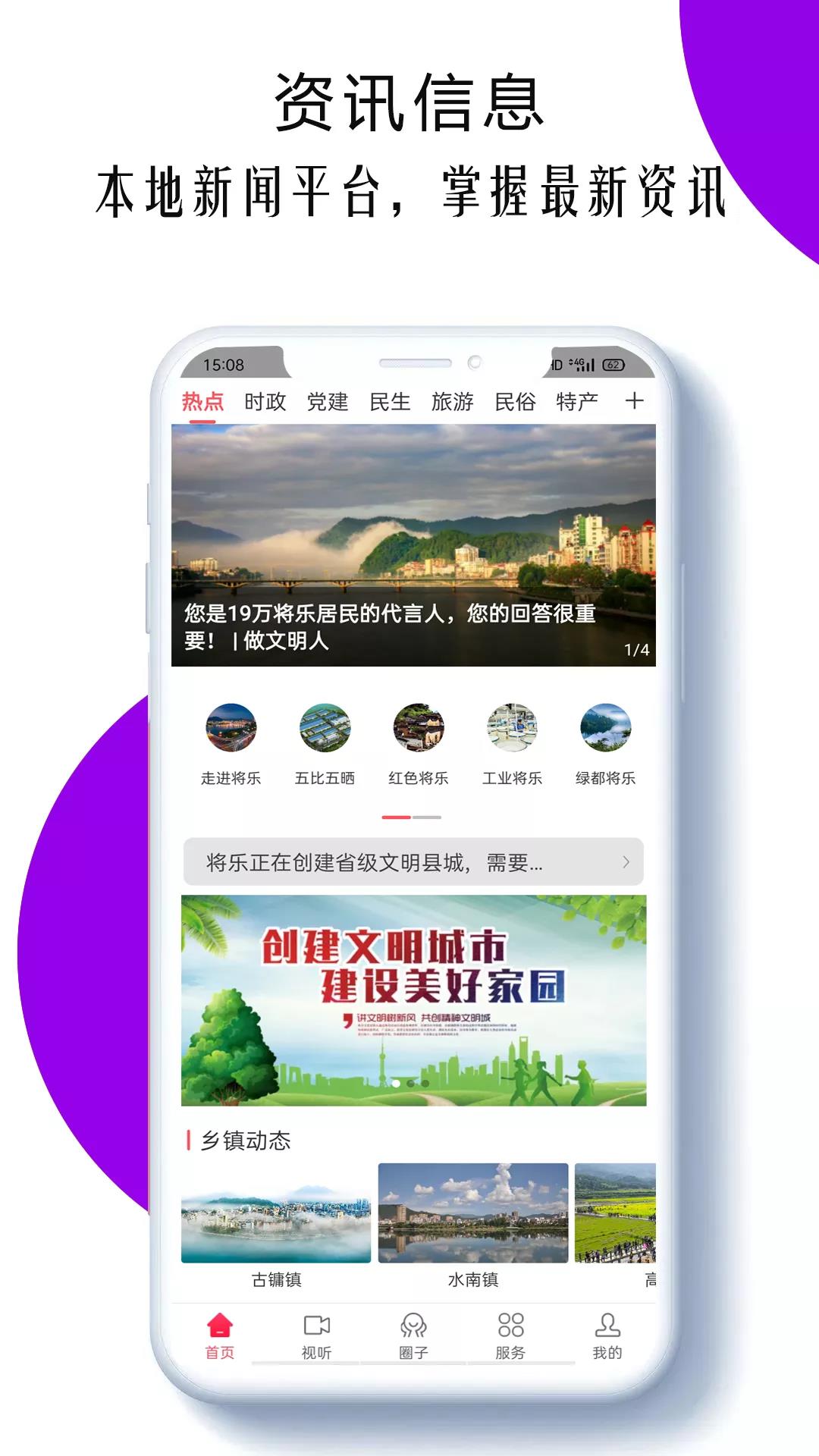 1、专为将乐制作的融媒体移动平台,平台拥有新闻,视听,圈子,服务等等功能内容;